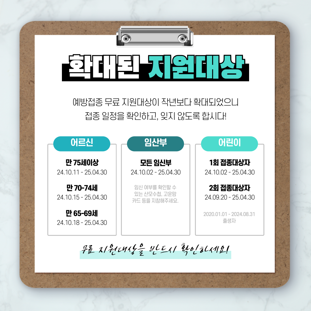 질병관리청에 의하면 인플루엔자 국가예방 접종은 2024년 9월 20일부터 2025년 4월 30일까지 실시합니다. 인플루엔자 감염되기 쉬운 6개월부터 13세 어린이, 임신부, 65세 이상 어르신 시작으로 무료접종을 합니다. 생후 6개월부터 13세 어린이는 2024년 9월 20일부터 4월 30일까지이고 임신부는 2024년 10월 2일부터 4월 30일까지입니다. 어르신은 10월 11일부터 4월 30일까지이니 참고하시길 바랍니다.