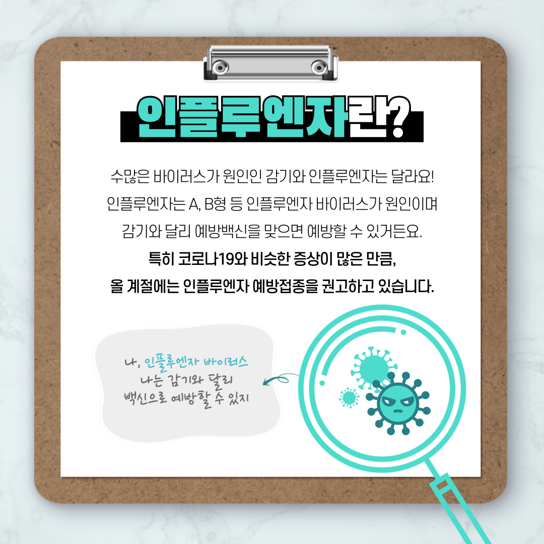 인플루엔자는 수많은 바이러스가 원인인 감기와 인플루엔자는 다릅니다. 인플루엔자는 A, B형 등 인플루엔자 바이러스가 원인으로 감기와 달리 예방백신을 맞으면 예방할 수 있습니다. 특히 코로나19와 비슷한 증상이 많은 만큼, 올 계절에는 인플루엔자 예방접종을 권고하고 있습니다.