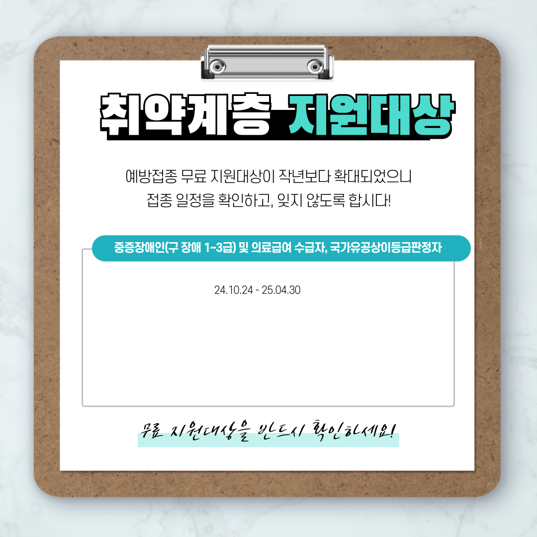 인플루엔자 예방접종을 하는 이유는 인플루엔자로 인하여 입원을 하게 될 수고 있고 이로 인해 사망에 이를 수 있으므로 이에 예방차원으로 실시합니다. 특히 감염에 쉽게 닿을 수 있는 어린이, 임신부, 어르신은 인플루인엔자 예방접종을 권고합니다. 예방접종을 통해 질병을 이기길 바랍니다.